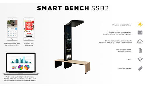 Smart benches can be placed anywhere, fast and easy and they offer an environmentally friendly solution for people to use a hot spot, charge their mobile devices, get useful information and at the same time the owner of the bench can send either software or actual visual messages to users and visitors.